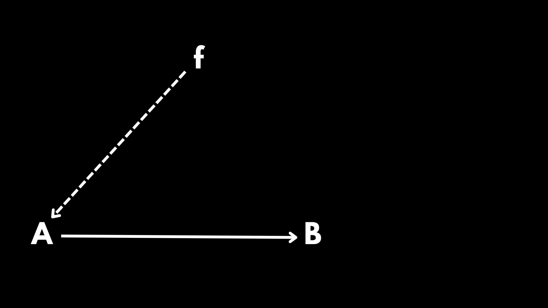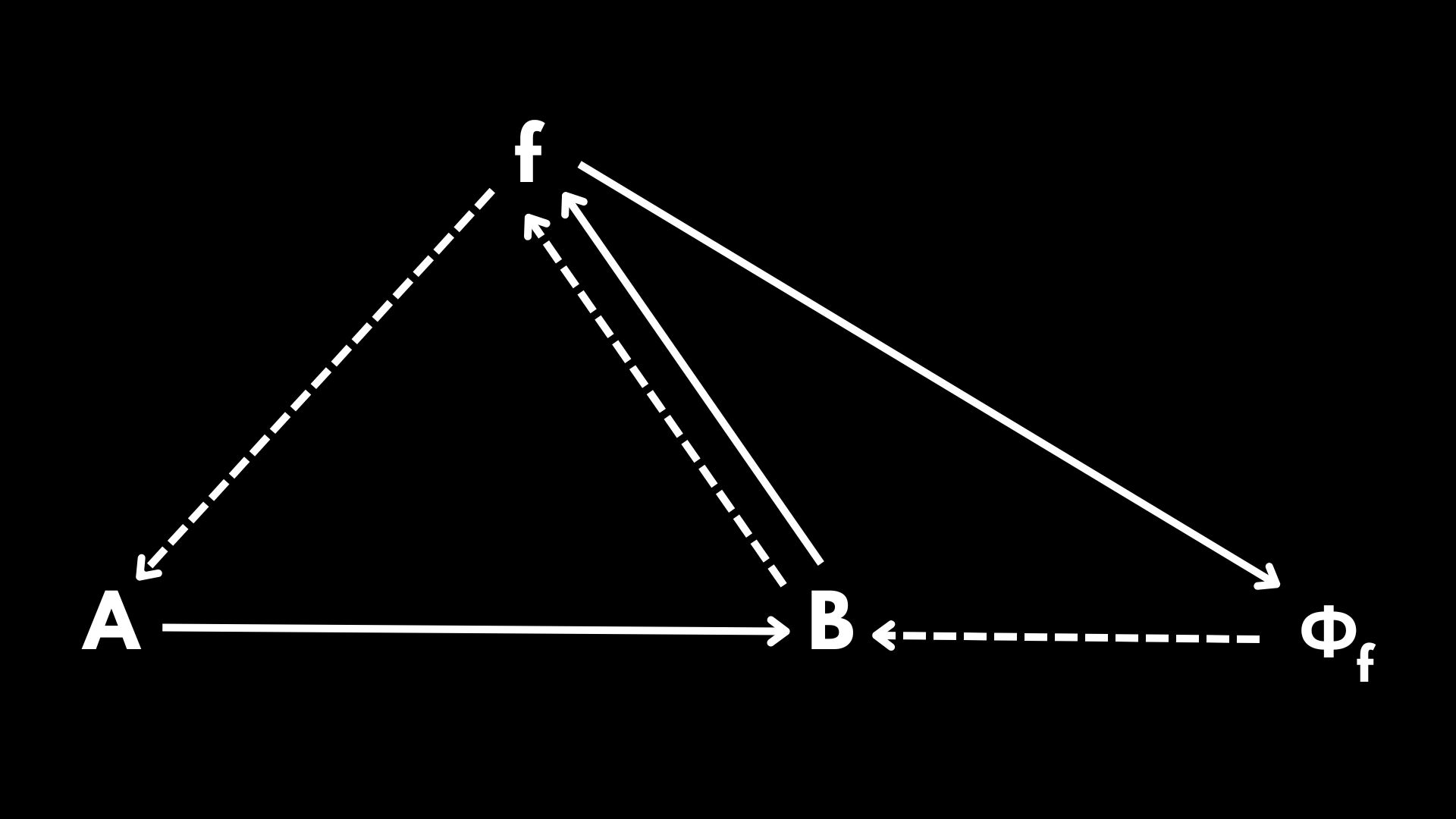 The diagram above is representing exactly our initial functional relation \(f(A)=B\), but now instead of putting the function \(f\) over the arrow, we recur to the usage of a dashed arrow pointing out to \(A\). This is telling us that when applying \(f\) to \(A\), we obtain \(B\) as a result. Furthermore, at this stage we can identify different modes of causation.